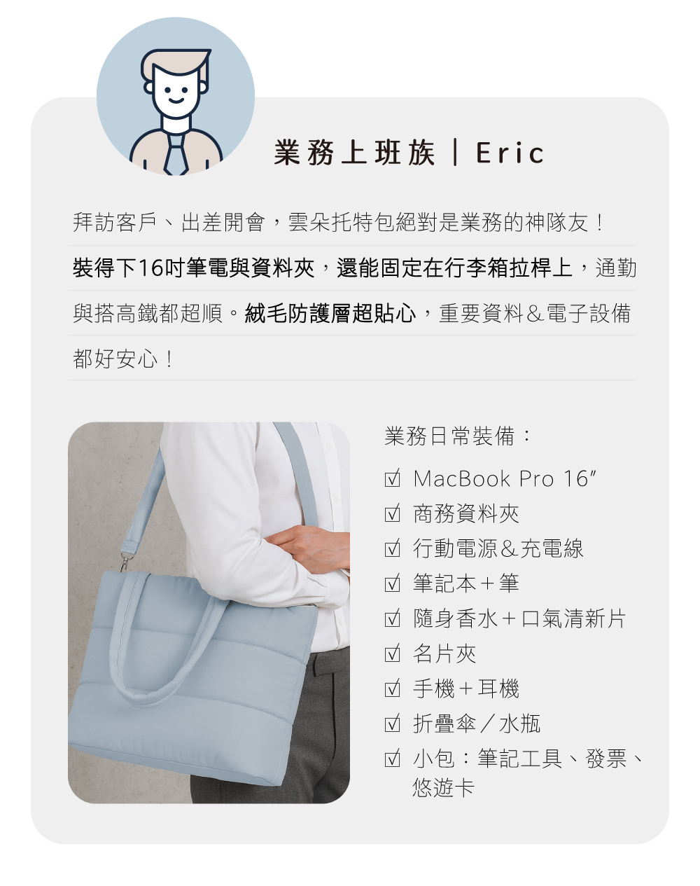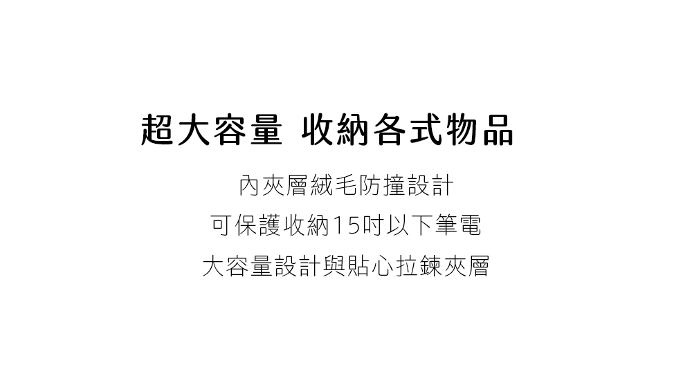 ▸絨毛層防護設計、可收納Mac 16" 或他牌15" 以下筆電